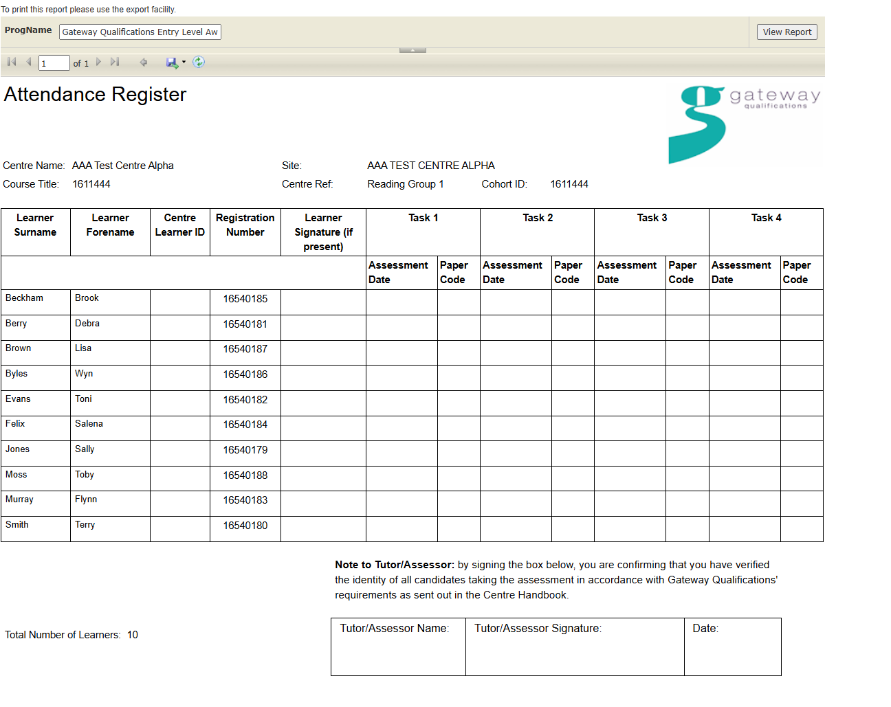 - Select ESOL Attendance Register (Entry Level – Level 1 Inc all S&L)