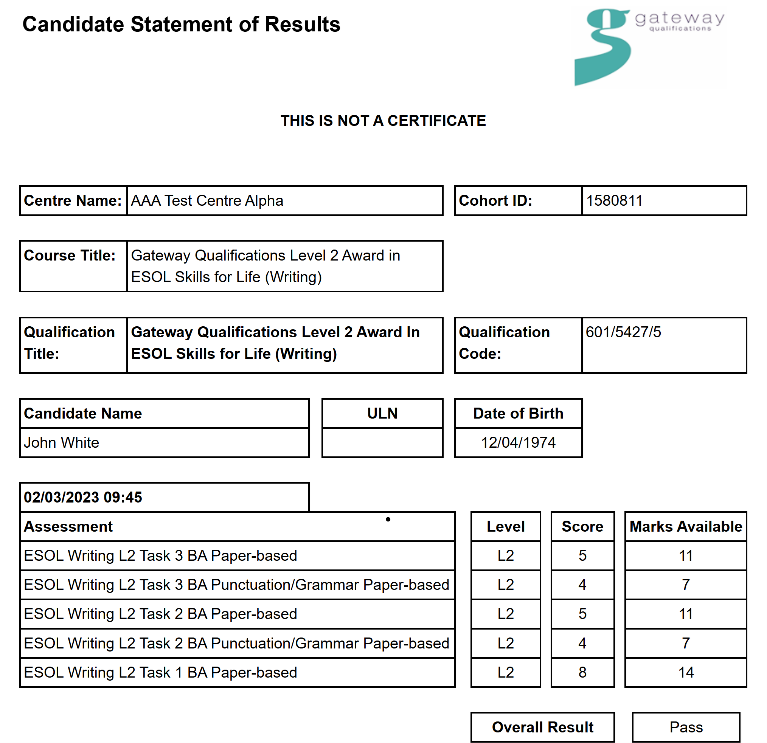 - The candidate statement of results report will appear. Use the arrow to access each learner’s results.