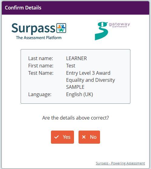 IMPORTANT Please ensure candidates double check the details on the screen to ensure the learner information is accurate before confirming identity and proceeding with the examination.