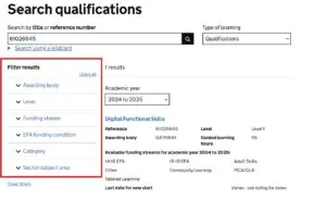 3. The Search results will show an overview, you can use the filters on the left hand side to narrow the search criteria by Awarding body, Level, Funding Stream, EFA funding condition, category (national funding), and Sector subject area
