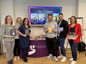 Gateway Qualifications staff holding books donated for Books for the Inside campaign.