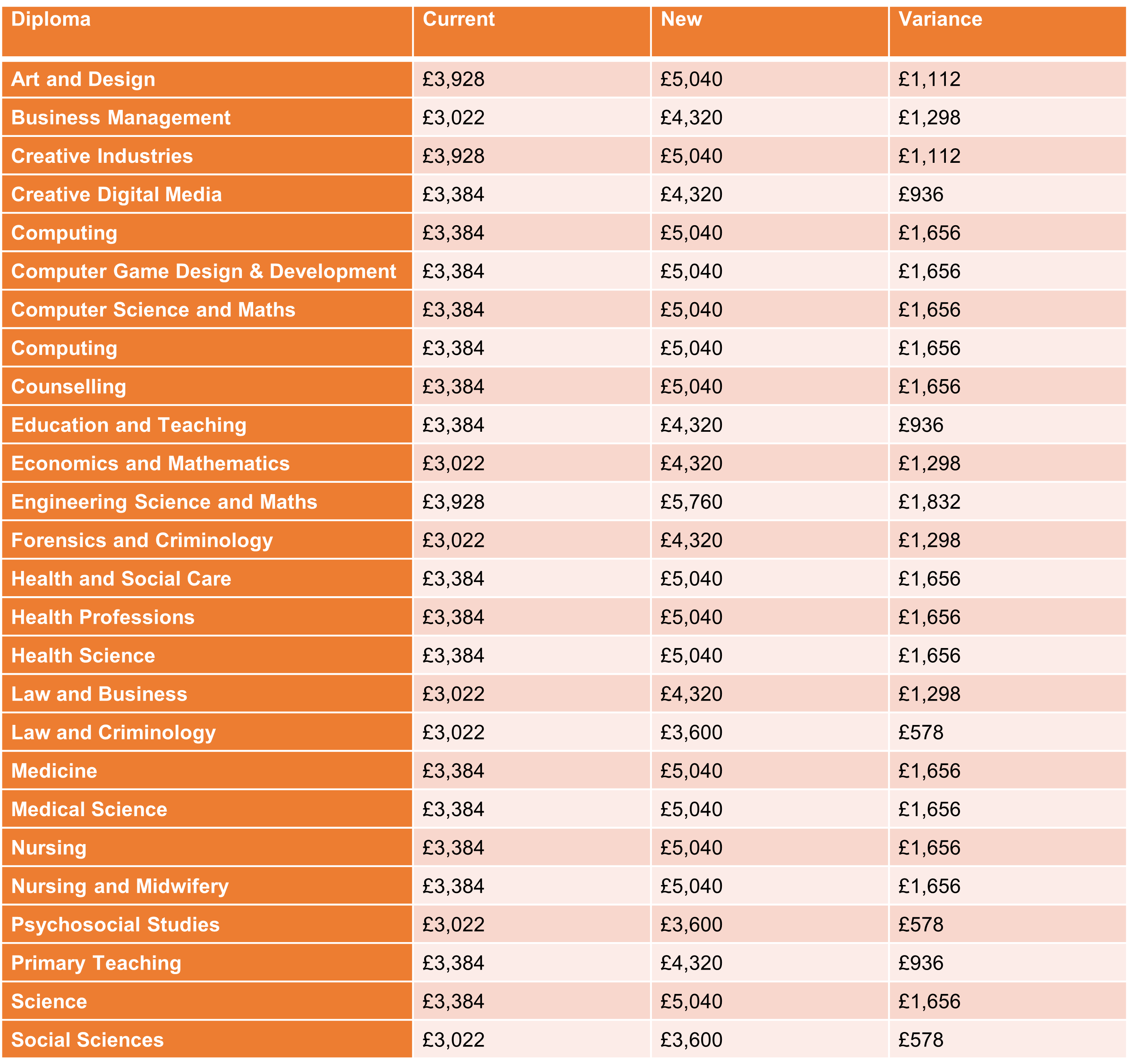Table 1 below compares current rates for a Diplomas with what they will be in 2024-2025 for eligible, fully funded learners ages 19-23:
